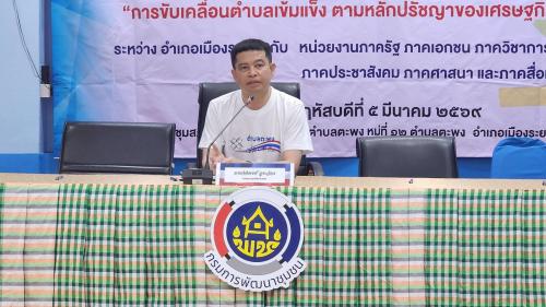 วันพฤหัสบดีที่ 5 มีนาคม 2569 เวลา 14.00 น. ณ ห้องประชุมสภา อบต.ตะพง จ.ระยอง สำนักงานพัฒนาชุมชนอำเภอเมืองระยอง จัดพิธีประกาศวาระและลงนาม MOU “ตำบลเข้มแข็งตามหลักปรัชญาของเศรษฐกิจพอเพียง” โดย นายกิติพงศ์ อุระวัตร นายอำเภอเมืองระยอง ให้เกียรติเป็นประธานในพิธีฯ พร้อมนำกล่าวประกาศวาระสำคัญ และลงนามบันทึกข้อตกลงความร่วมมือ (MOU) เพื่อผนึกกำลัง "กลไก 7 ภาคีเครือข่าย" (ภาครัฐ, เอกชน, วิชาการ, ประชาชน, ประชาสังคม, ศาสนา และสื่อมวลชน) มุ่งเป้าหมายขับเคลื่อนตำบลเข้มแข็ง 3 มิติ: มั่นคง มั่งคั่ง ยั่งยืน ในการนี้ นางนารีรัตน์ แย้มกลิ่น พัฒนาการอำเภอเมืองระยอง ได้ชี้แจงวัตถุประสงค์และแนวทางการขับเคลื่อนในพื้นที่ ซึ่งมีผู้เข้าร่วมกิจกรรม ประกอบด้วย หัวหน้าส่วน/ผู้แทนส่วนราชการระดับอำเภอ/ท้องถิ่น นายก อบต.ตะพง ผู้นำท้องที่ ผู้นำท้องถิ่น และภาคีเครือข่าย รวม 50 คน